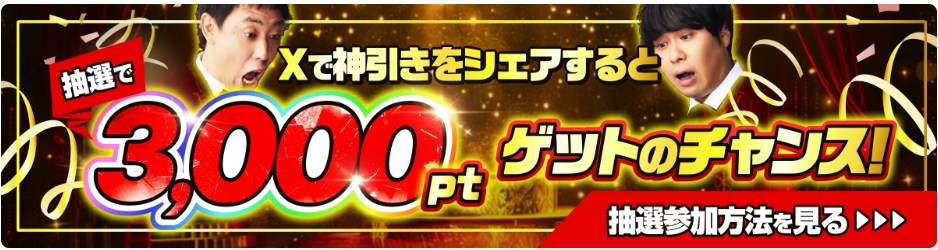 当選結果をXでシェアすると、抽選で3,000ptが当たるキャンペーンです。