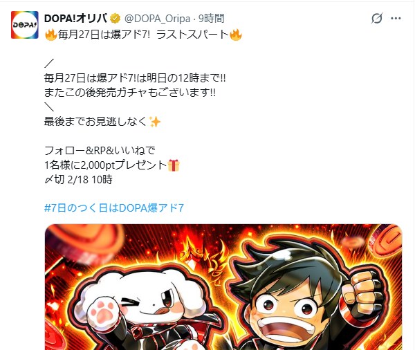 DOPA公式Xでは、フォロー&RPでポイント配布抽選を毎日実施!