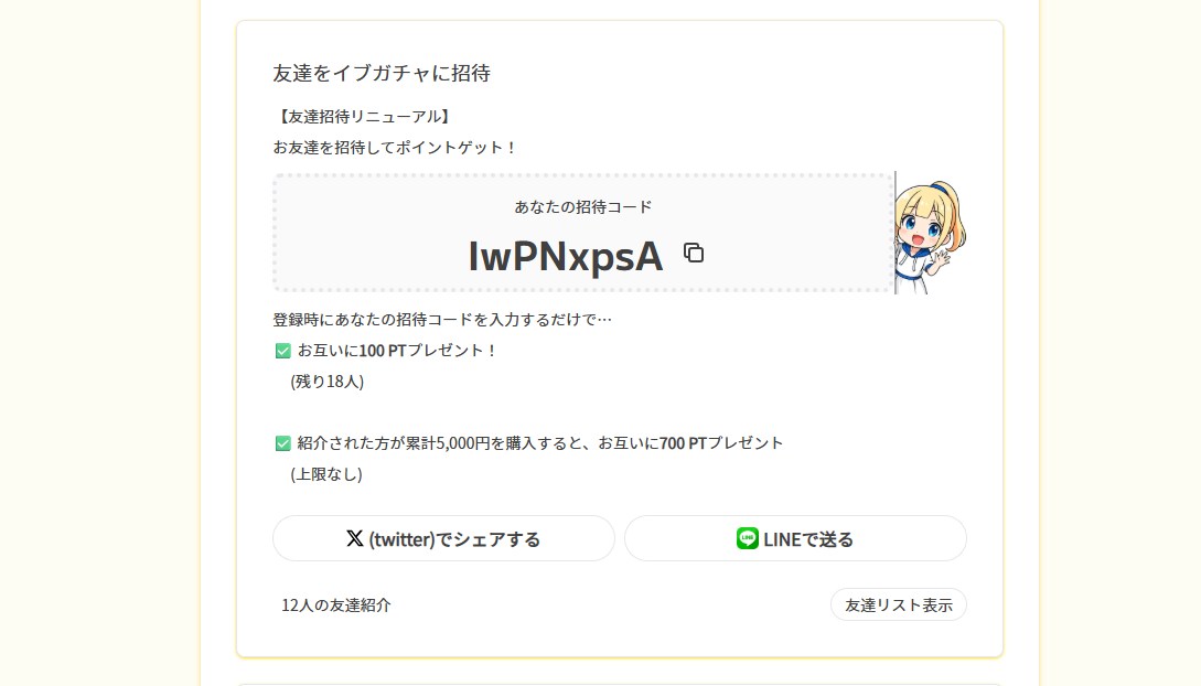 イブガチャでは、新規会員登録時に招待コードを入力できる欄があり、それを使うことで紹介者にポイント還元などの特典が入るようになっています。