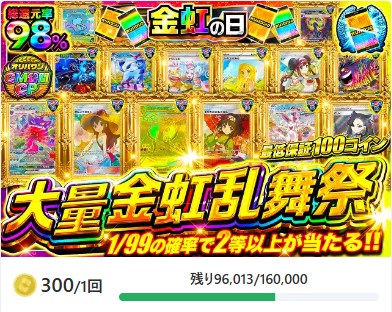 ちなみに最低保証100コインなので実質200コインで挑戦でき、3等でもイーブイヒーローズなどのパックがもらえる。