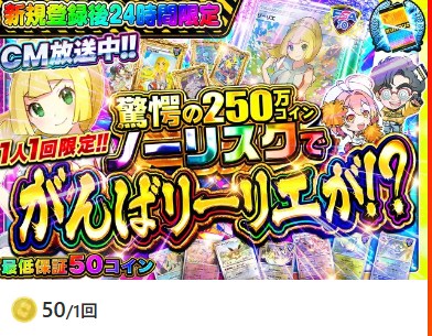 新規登録特典やキャンペーン時には、50〜100コイン程度で引けるアド確定・最低保証付きガチャが用意されることがあります。