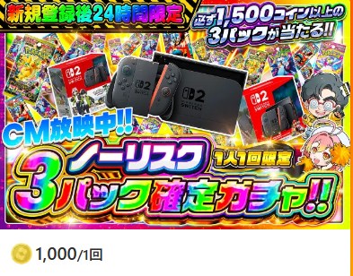 一回1000コインで1500コイン以上の3パックが必ず当たります。