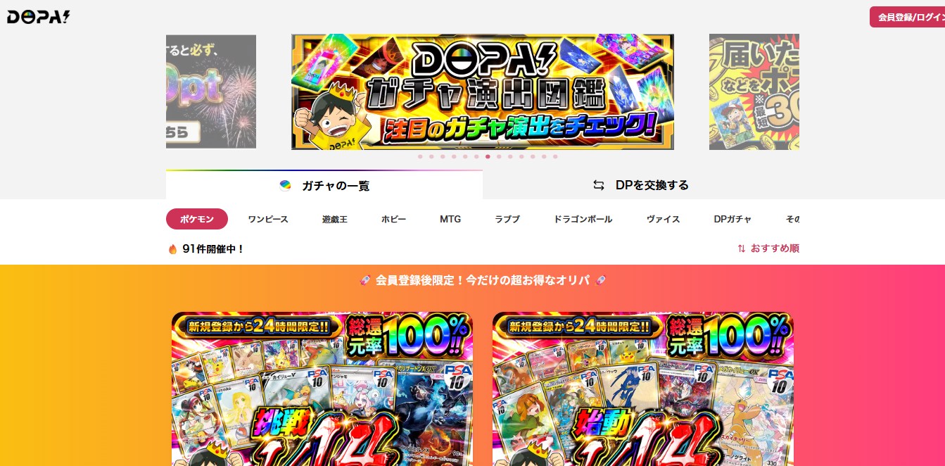 ![]() DOPA! | ・豊富なオリパの種類 ・ハイクオリティな演出 ・友達招待で800p | 175,249 | ー | 300+500 | 100 | 無料 | クレジットカード、銀行振込、 Paypay、Apple Pay、Google Pay、Amazon Pay、コンビニ、メルペイ、Paidy |