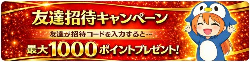 さらに自身の招待コードを使って友達招待すると最大1000pt追加でもらえます。