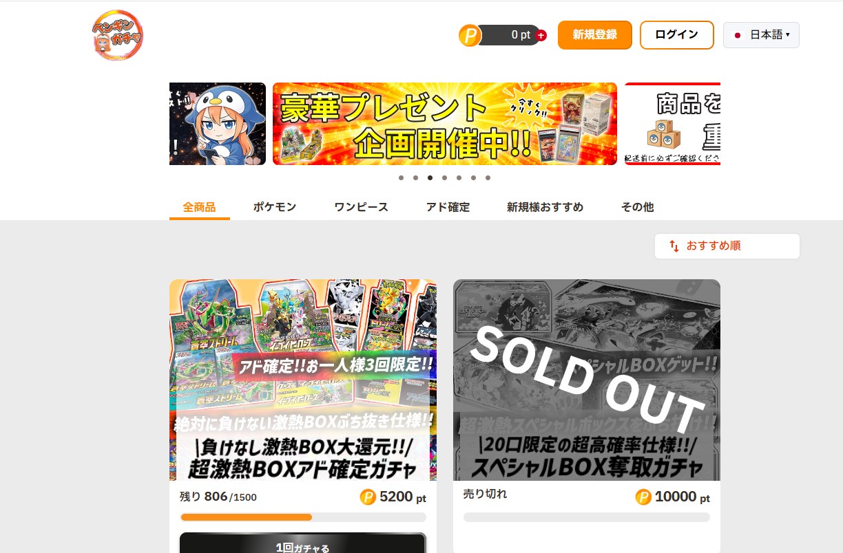 ペンギンガチャは、オンラインで手軽にオリパ(オリジナルパック)を楽しめるサービスです。