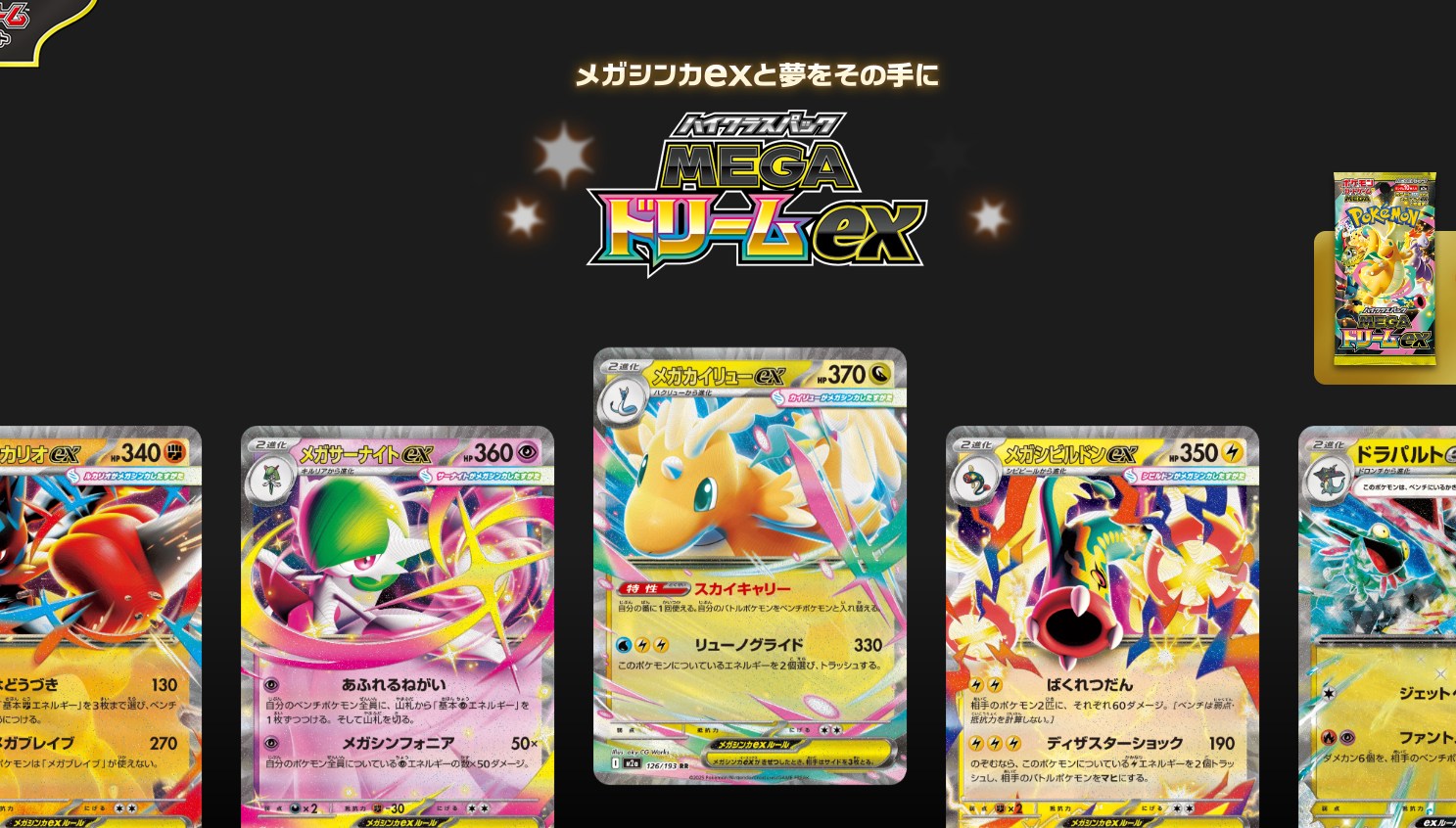 メガリザードンXex(MURやSAR)は発売直後から数万円~10万円近い相場を維持しており、投資・コレクション面で大注目。キャラ枠の「ヒカリSAR」、人気ポケモン「オドリドリSAR」なども市場価値が高いです。